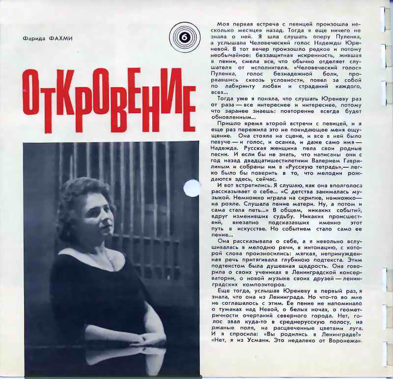 Звуковая страница 11 - Певица Надежда Юренева. 'Ой, девчоночки мои' В.Гаврилина. Финальная сцена из оперы Пуленка 'Человеческий голос'.