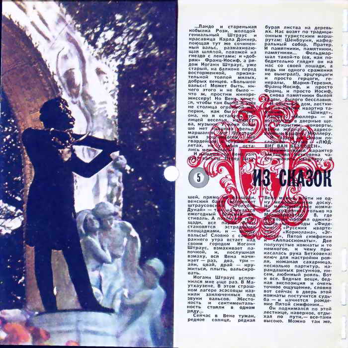 ИЗ СКАЗОК О ВЕНСКОМ ЛЕСЕ ┘Ландо и старенькая кобылка Рози, молодой гениальный Штраус и красавица Карла Доннер, поющая тут же сочинённый вальс, размахивающая шляпой, похожей на гнездо с лентами; и 'добряк' Франц-Иосиф, а рядом Иоганн Штраус, уже старый, на балконе перед восторженной, признательной толпой милых, добрых венцев. 'Большой вальс'! Может быть, ничего этого и не было - что ж, простим кинорежиссёру! Но Вене хочется, чтобы так было! Я уже не столица огромной империи, как бы говорит она, но я останусь столицей веселья, изящества, музыки. У меня больше нет пышных фельдмаршалов, нет блистающих эрцгерцогов, нет гвардейцев в белых колетах, но у меня остались мои вальсы! И каждый год Вена танцует вальсы. Перед ратушей, прямо на площади, венский балет исполняет штраусовский 'Голубой Дунай' - так начинается ежегодный Венский фестиваль. А потом все площади, все парки Вены становятся эстрадными площадками, и - всюду вальсы! Словно с самого раннего утра встает над своим городом Иоганн Штраус, взмахивает палочкой, и, послушная взмаху, вся Вена начинает - раз, два, три - айн, цвай, драй - кружиться, плыть, вальсировать. Иоганн Штраус вспомнился мне ещё раз. В Маутхаузене. В этом страшном лагере эсэсовцы казнили заключённых под звуки вальсов. Жестокость и сентиментальность стояли в одном ряду┘ Сейчас в Вене туман, редкое солнце, редкая бурая листва на деревьях. Нас возят по традиционным туристским маршрутам: Шёнбрунн, кафедральный собор, Пратер. И памятники, памятники, памятники┘ Фельдмаршал какой-то (ох, как победительно глядит он на нас со своей лошади, а ведь ни одного сражения не выиграл!), эрцгерцоги и просто герцоги, генералы, Мария-Терезия, Франц-Иосиф, и просто Иосиф, и снова памятники былой славы, былого бесславия. И обычный дом, лестница, на дверях квартир таблички: 'Шмидт', 'Крафт', 'Мюллер' - и воткнутые в дверные щели открытки, конверты, яркие журналы, адресованные Крафту, Мюллеру. И только на самом последнем этаже - 'ЛЮДВИГ ВАН БЕТХОВЕН'. Неуживчивый характер заставлял Бетховена часто менять квартиру. В Вене можно найти не одну мемориальную доску. Но мемориальные комнаты сохранились только на Мелькерпастер, 8, где Бетховен прожил одиннадцать лет - годы 'Фиделио', 'Русских квартетов', 'Кориолана', 'Эгмонта', Пятой симфонии и 'Аппассионаты'. Две полупустые комнаты и то немногое, к чему прикасалась рука Бетховена: ключ для настройки рояля, кожаная сахарница, несколько партитур, карандашных рисунков, писем, любимый рояль. Вот и всё. Бедные вещи, бедная экспозиция и очень точное ощущение, словно вот сейчас в дверь этой комнаты постучится судьба - и начнется рождение Пятой симфонии┘ Он поднимался по этой лестнице, наверное, отдыхал по пути, - все-таки высоко. Можно так же, как он, подойти к окну и увидеть то, что видел он┘ Можно даже прикоснуться к роялю и сыграть на нём наши русские 'Ах, талан, ты мой талан' и величальную 'Славу', которые так не по-русски прозвучали в его 'Русских квартетах'. Случилось так, что с Бетховеном мы встретились и в городе другого великого композитора - в моцартовском Зальцбурге. Мы осматривали Фестивальхауз - бывшие епископские конюшни. Многозальное здание пристроено прямо к отвесной скале. Открытая сцена - бывший манеж. В скале вырублено несколько ярусов галерей. Отсюда зрители смотрели на верховую езду. Теперь галереи стали сценой, ма