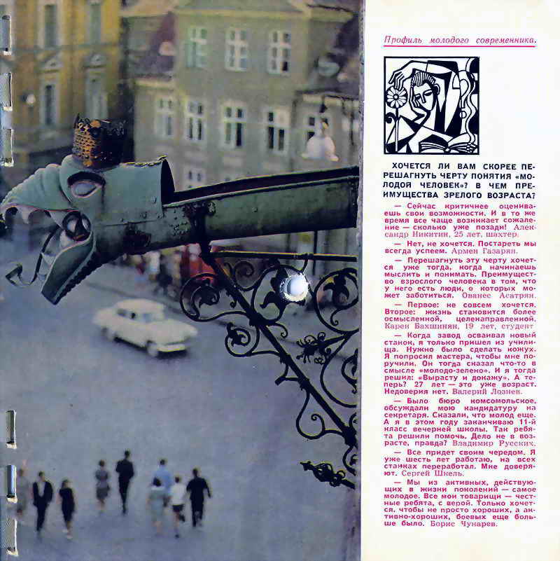Профиль молодого современника. ХОЧЕТСЯ ЛИ ВАМ СКОРЕЕ ПЕРЕШАГНУТЬ ЧЕРТУ ПОНЯТИЯ 'МОЛОДОЙ ЧЕЛОВЕК'? В ЧЁМ ПРЕИМУЩЕСТВА ЗРЕЛОГО ВОЗРАСТА? - Сейчас критичнее оцениваешь свои возможности. И в то же время всё чаще возникает сожаление - сколько уже позади! Александр Никитин, 25 лет, шахтёр. - Нет, не хочется. Постареть мы всегда успеем. Армен Газарян. - Перешагнуть эту черту хочется уже тогда, когда начинаешь мыслить и понимать. Преимущество взрослого человека в том, что у него есть люди, о которых может заботиться. Ованес Асатрян. - Первое: не совсем хочется. Второе: жизнь становится более осмысленной, целенаправленной. Карен Бахшинян, 19 лет, студент - Когда завод осваивал новый станок, я только пришел из училища. Нужно было сделать кожух. Я попросил мастера, чтобы мне поручили. Он тогда сказал что-то в смысле 'молодо-зелено'. И я тогда решил: 'Вырасту и докажу'. А теперь? 27 лет - это уже возраст. Недоверия нет. Валерий Лознев. - Было бюро комсомольское, обсуждали мою кандидатуру на секретаря. Сказали, что молод ещё. А я в этом году заканчиваю 11-й класс вечерней школы. Так ребята решили помочь. Дело не в возрасте, правда? Владимир Русских. - Всё придёт своим чередом. Я уже шесть лет работаю, на всех станках переработал. Мне доверяют. Сергей Шкель. - Мы из активных, действующих в жизни поколений - самое молодое. Все мои товарищи - честные ребята, с верой. Только хочется, чтобы не просто хороших, а активно-хороших, боевых ещё больше было. Борис Чунарёв. |