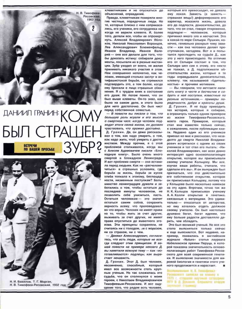 ДАНИИЛ ГРАНИН: КОМУ БЫЛ СТРАШЕН ЗУБР? (окончание) ┘клеветниками и не опускаться до объяснений, оправданий. Правда, клеветникам поверили многие честные, порядочные люди. Но те, которые близко с ним соприкасались, его ученики, его сотрудники никогда не верили клевете. И, более того, делали всё, чтобы её опровергнуть. Алексей Владимирович Яблоков, Николай Николаевич Воронцов, Лев Александрович Блюменфельд, Иванов Владимир, Иванов Валерий - они всё делали для того, чтобы доказать истину: собирали документы, посылали их в разные инстанции. Зубр уходил от всего, не желая принимать никакого участия в этом. Нам совершенно непонятно, как человек, имеющий столько заслуг в антифашистской борьбе, не стремился подтвердить это, а тем более, когда ему бросали в лицо страшные обвинения. Я с трудом вник в состояние его души. Но потом понял, что он был выше клеветы. Он-то знал, как было на самом деле, и этого было для него достаточно. Он был чист перед собственной совестью. - В повести вы писали о том, что большую роль играли и его мысли о смертном часе: когда человек подводит итоги своей жизни, он должен чувствовать, что прожил достойно. Д.Гранин. Да, он даже рассказывал о том, как надо умирать, о том, как надо жить, чтоб умереть с достоинством. Между прочим, я с этой проблемой сталкивался, когда мы с Алесем Адамовичем писали 'Блокадную книгу'. Было очень много смертей в блокадном Ленинграде. И вот проблема смерти - она вставала перед людьми. Как не 'расчеловечиться' в страшных условиях, где борьба за жизнь, борьба за кусок хлеба толкала к эгоизму, беспощадности, низменным поступкам? Большинство ленинградцев думали и заботились о том, чтобы остаться до последней минуты человеком, не позволить себе унизиться, пасть. Остаться человеком - это значит остаться самим собой, сохранить верность всему, что проповедовал, во что верил. Человек не имеет права на то, чтобы жить за счёт других, выживать за счёт других, не имеет права опуститься до животного эгоизма. Эти принципы сохраняли, не считаясь ни с голодом, ни с морозом, ни со страхом, ни с чем. - Даниил Александрович, согласитесь, что есть люди, которые не всегда следуют этим принципам. В вашей повести на примере некоего Д. вы наметили важную тему - как 'изготавливаются' подлецы, как вырастает ненависть. Д.Гранин.Этот Д. был человек, несомненно, способный, который имел все возмож-ности стать крупным учёным. Но так сложилась его судьба, что он столкнулся с моим героем, с Николаем Владимировичем Тимофеевым-Ресовским. И вот ощущение того, что рядом есть человек, который его превосходит, не давало ему покоя. Зависть (а зависть - страшная вещь!) деформировала его характер, исказила жизнь, довела его до подлости, доносительства, до того, что он стал, говоря откровенно, подлецом - человеком, который причинил много зла и несчастий. Это в какой-то мере Сальери. Пушкин, конечно, гениально раскрыл тему зависти - как она человека делает преступником, негодяем. Вот я и попытался проследить на судьбе Д., как это у него происходило. Но отличие его от Сальери состоит в том, что Сальери шёл сам к этому, его никто не толкал, а Д. подталкивали обстоятельства жизни, которые в те годы оправдывали доносительство, клевету, так называемой 'бдительностью' и прочими мотивами. - Вы говорили, что мечтаете написать книгу о чести и бесчестии и собрать в ней поступки, и