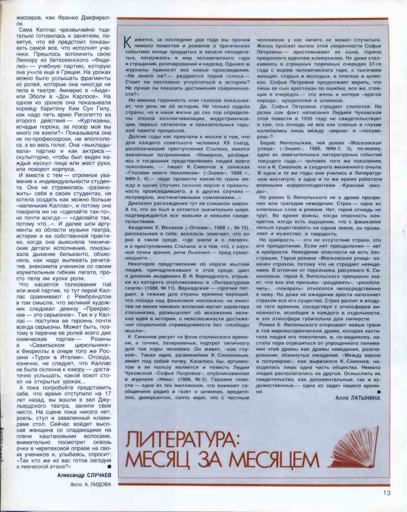 ---------------------------------------------------------------------------------------------------------------------------------------------- ЛИТЕРАТУРА: МЕСЯЦ ЗА МЕСЯЦЕМ Кажется, за последние два года мы прочли немало повестей и романов о трагических событиях конца тридцатых и начала пятидесятых, погружаясь в мир человеческого горя и страданий, разочарований и надежд. Однако ж журналы приносят всё новые произведения. 'Не много ли? - раздаются порой голоса.- Стоит ли постоянно углубляться в историю? Не лучше ли показать достижения современности?' Но именно горячность этих голосов показывает, что речь не об истории. Не только судьба страны, но и наши жизни до сих пор определены эпохой коллективизации, индустриализации, первых пятилеток и показательных горькой памяти процессов. Долгие годы нас приучали к мысли о том, что для каждого советского человека XX съезд, разоблачивший преступления Сталина, явился внезапным потрясением. 'Наверное, разбираясь в тогдашних представлениях людей моего поколения, - пишет К.Симонов в записках 'Глазами моего поколения' ('Знамя', 1988 г., ??3, 4),- надо провести какие-то грани между в одних случаях полною верою в правильность происходившего, а в других случаях - полуверою, инстинктивными сомнениями...' Диапазон расхождения тут не слишком широк. А то, что он был и остаётся значительно шире, подтверждается всё новыми и новыми свидетельствами. Академик Е.Велихов ('Огонёк', 1988 г., ? 15), рассказывая о себе, вскользь замечает, что он рос в такой среде, 'где знали и о лагерях, и о преступлениях Сталина, и о том, что, с научной точки зрения, речи Лысенко - бред сумасшедшего'. Некоторое представление об образе мыслей людей, принадлежавших к этой среде, даёт и дневник академика В.И.Вернадского, отрывки из которого опубликованы в 'Литературной газете' (1988, ?11). Вернадский - горячий патриот, в тяжкие для страны времена верящий, что победа над фашизмом неизбежна, не имеет тем не менее никаких иллюзий насчёт характера сталинизма, размышляет об искажении великих идей в истории, о невозможности достижения социальной справедливости без 'свободы мысли'. К.Симонов рисует на фоне сталинского времени, а точнее, безвременья, портрет типичного для той поры человека. Он живёт, 'как глухой'. Такая идея, развиваемая К.Симоновым, имеет под собой почву. Казалось бы, аргументом в её пользу является и повесть Лидии Чуковской 'Софья Петровна', опубликованная в журнале 'Нева' (1988, ?2). Героиня повести - одна из тех миллионов, что внимают сообщениям радио и газет о шпионах, вредителях, диверсантах, свято веря, что с честным человеком у нас ничего не может случиться. Жизнь бросает вызов этой уверенности Софьи Петровны - арестовывают её сына, горячо преданного идеалам коммунизма. Но даже сталкиваясь в страшных тюремных очередях 37-го года с морем человеческого горя, с тысячами женщин, старых и молодых, в платках и шляпках, Софья Петровна продолжает верить, что лишь её сын арестован по ошибке, все же, стоящие в очередях,- это жёны и матери 'врагов народа', вредителей и шпионов. Да, Софья Петровна страдает слепотой. Но разве сам факт написания Лидией Чуковской этой повести в 1939 году не свидетельствует о том, что отнюдь не все как слепые и глухие колебались лишь между 'верою' и 'полуверою'? Борис Ямпольский, чей роман 'Московская улица' ('Знамя', 1988, ??2, 3), по-моему, одно из замечательных литературных событий текущего года,- человек того же по
